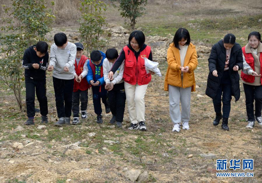 陳可英(右四)、包養志愿者和孩子們在侯門山村落藏書樓邊的一塊空位里播撒花草種子以醜化周遭的狀況(2月6日攝)。